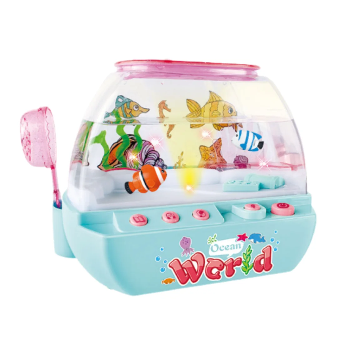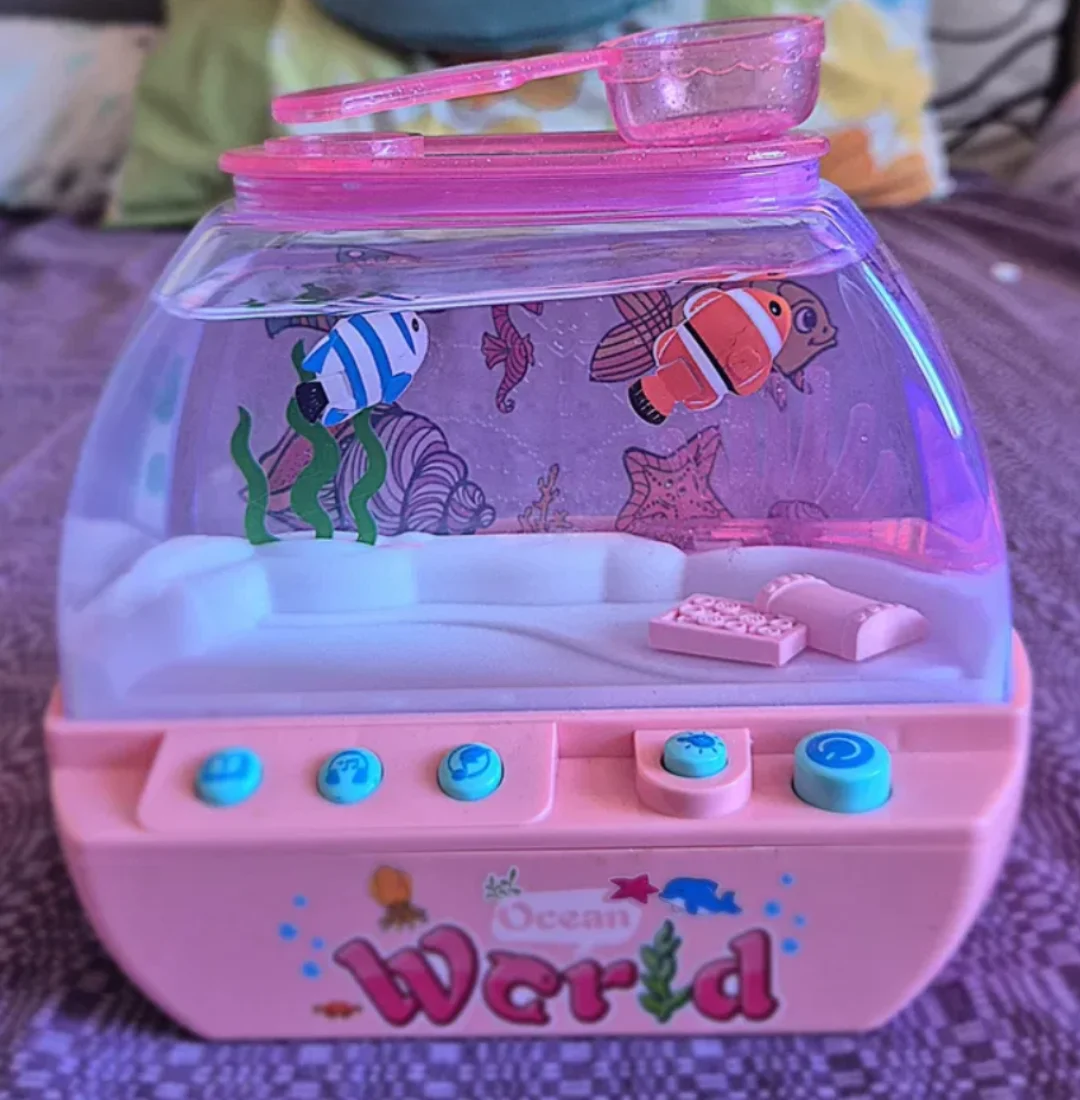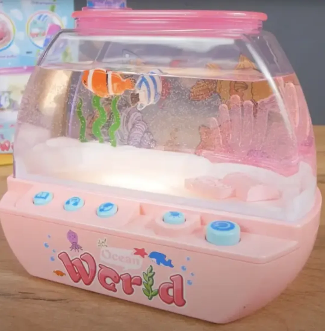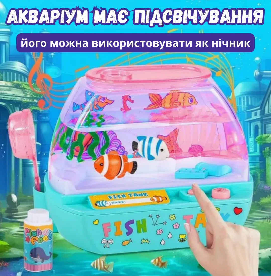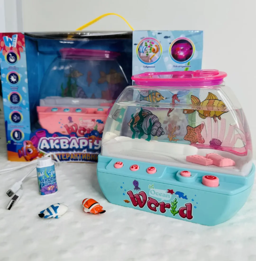 Неймовірна музична іграшка – водонепроникний акваріум з рибками – це справжня магія у дитячій кімнаті! Яскраві кольорові рибки плавно рухаються у воді, створюючи заспокійливу атмосферу, а якщо піднести спеціальну пляшечку з "кормом" до стінки акваріума – вони одразу пожвавлюються та починають слідувати за нею.