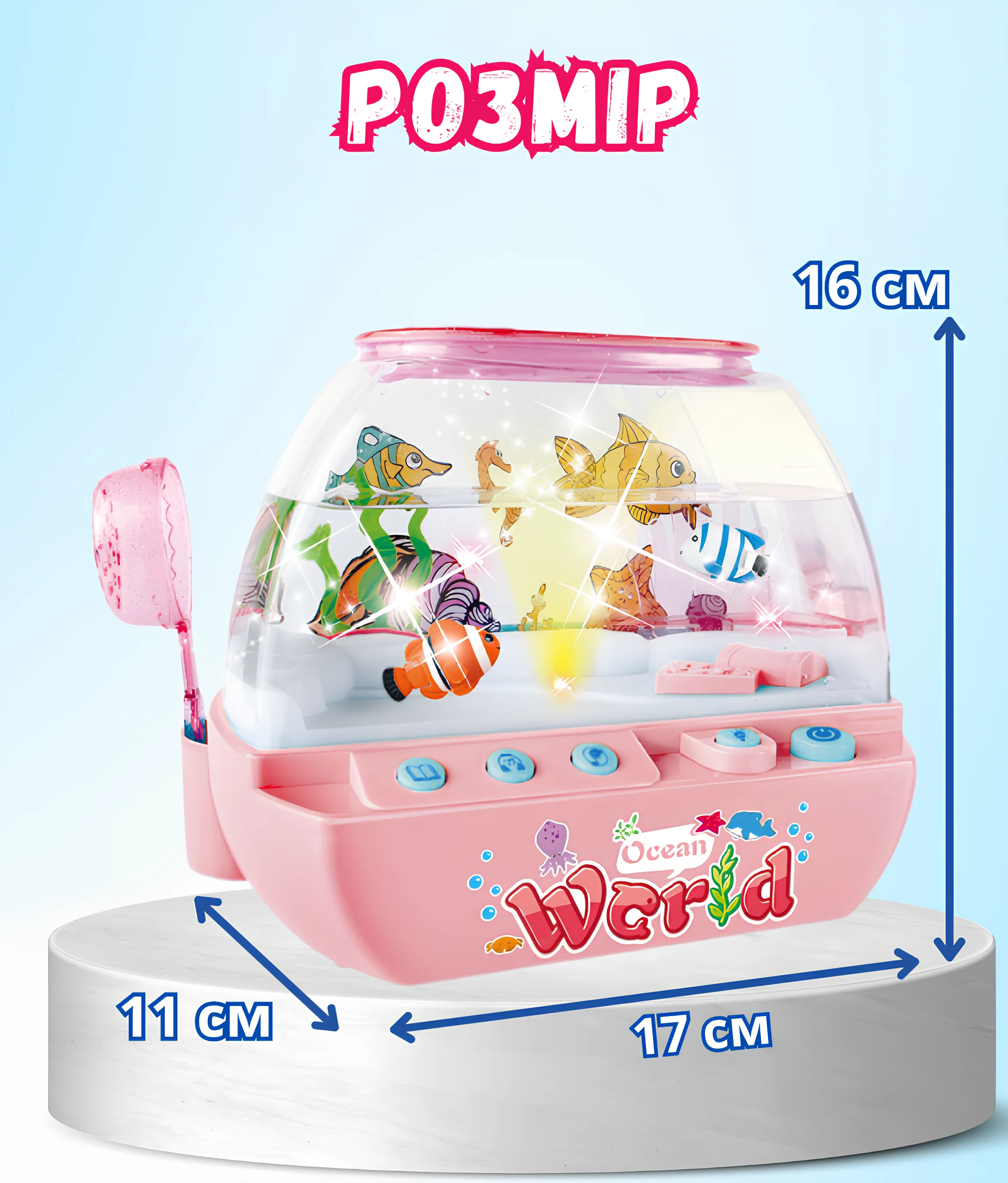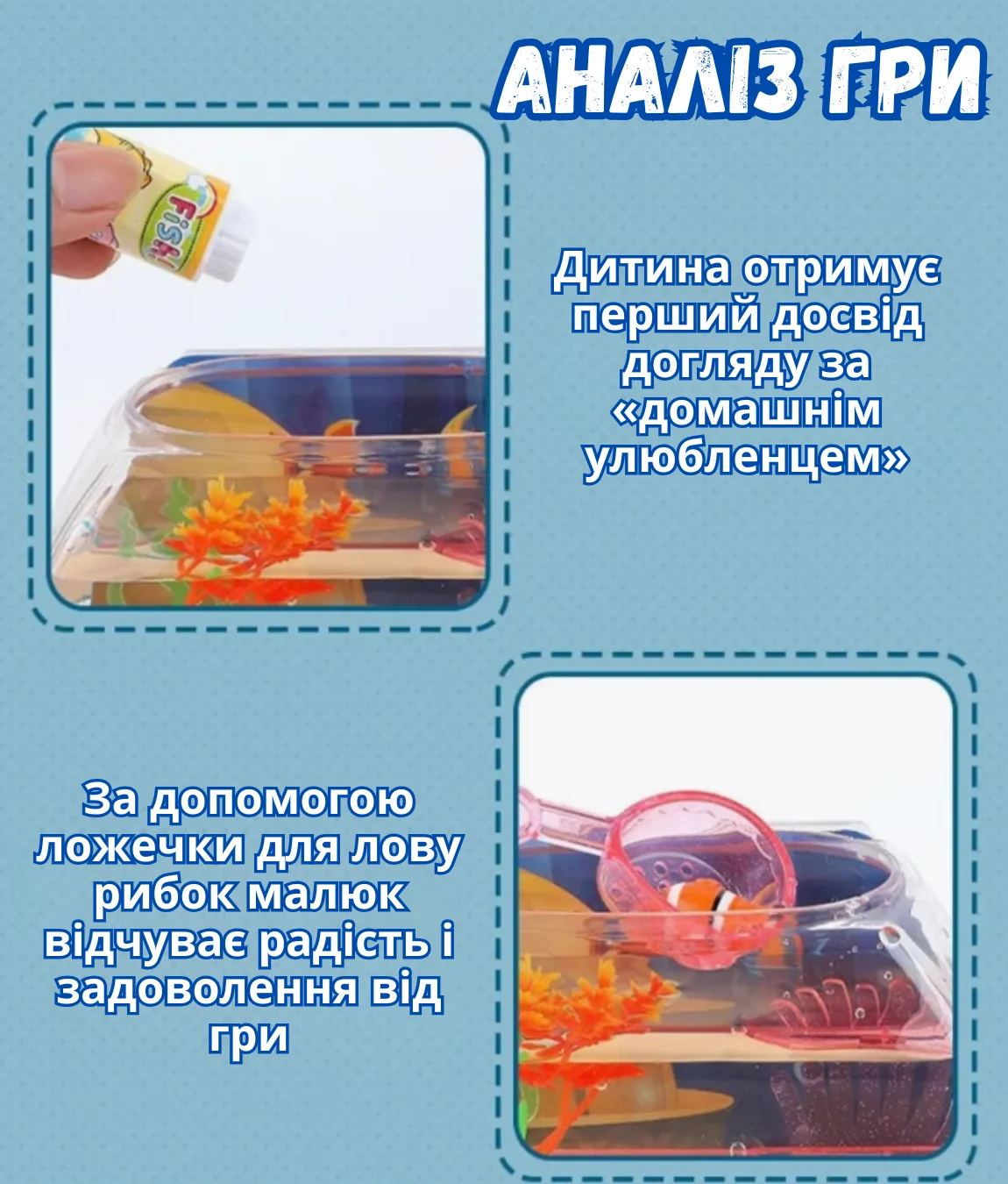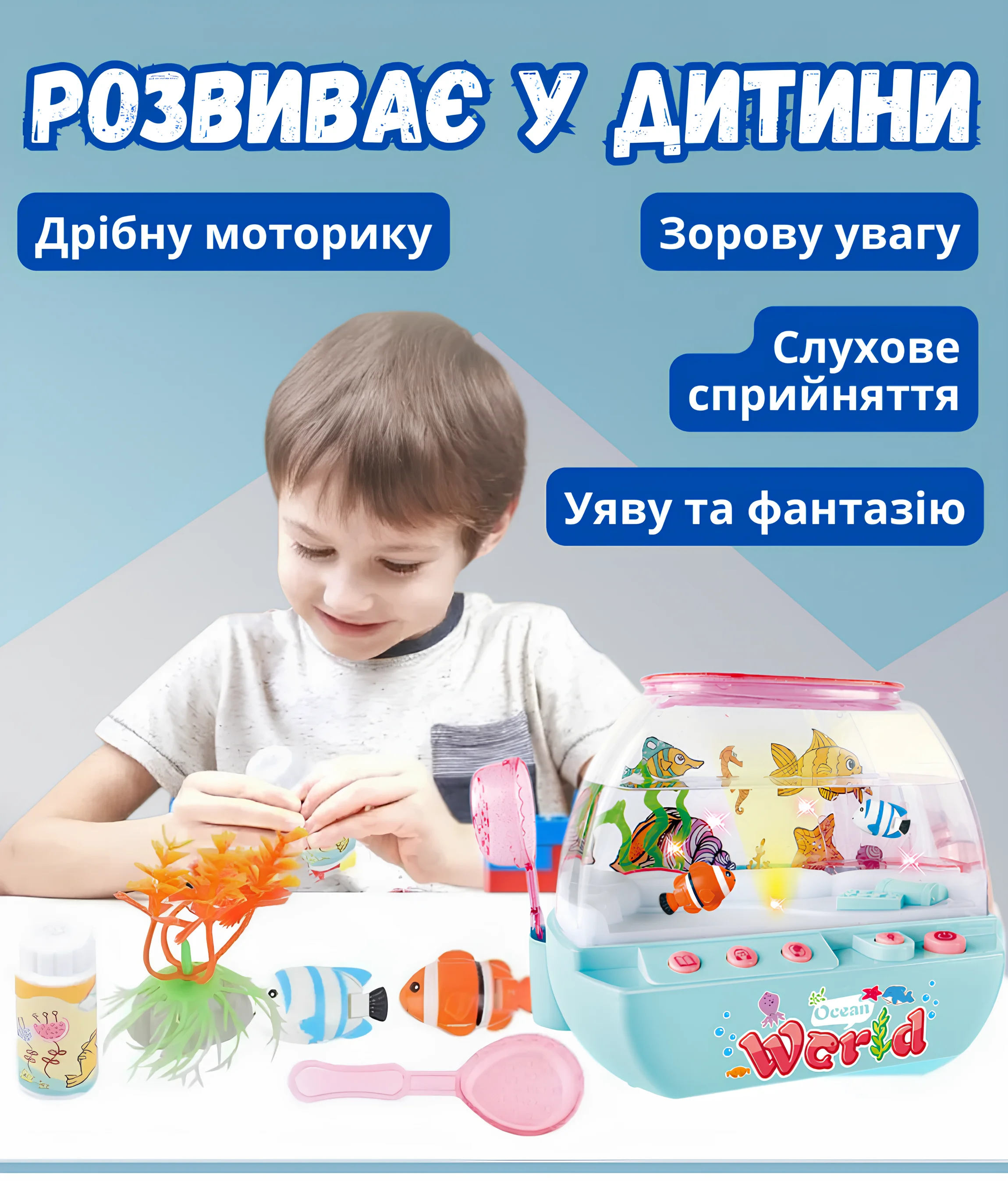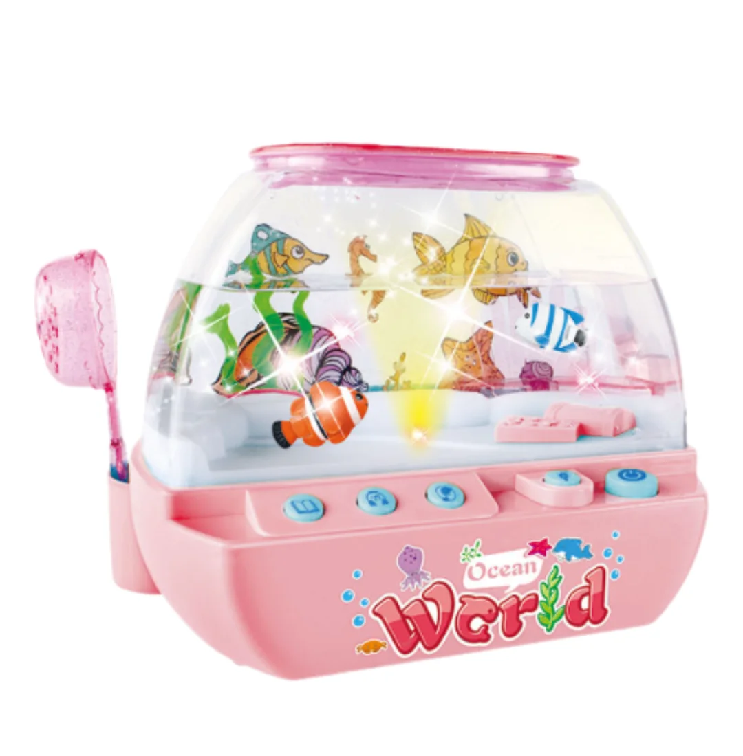 Неймовірна музична іграшка – водонепроникний акваріум з рибками – це справжня магія у дитячій кімнаті! Яскраві кольорові рибки плавно рухаються у воді, створюючи заспокійливу атмосферу, а якщо піднести спеціальну пляшечку з "кормом" до стінки акваріума – вони одразу пожвавлюються та починають слідувати за нею.